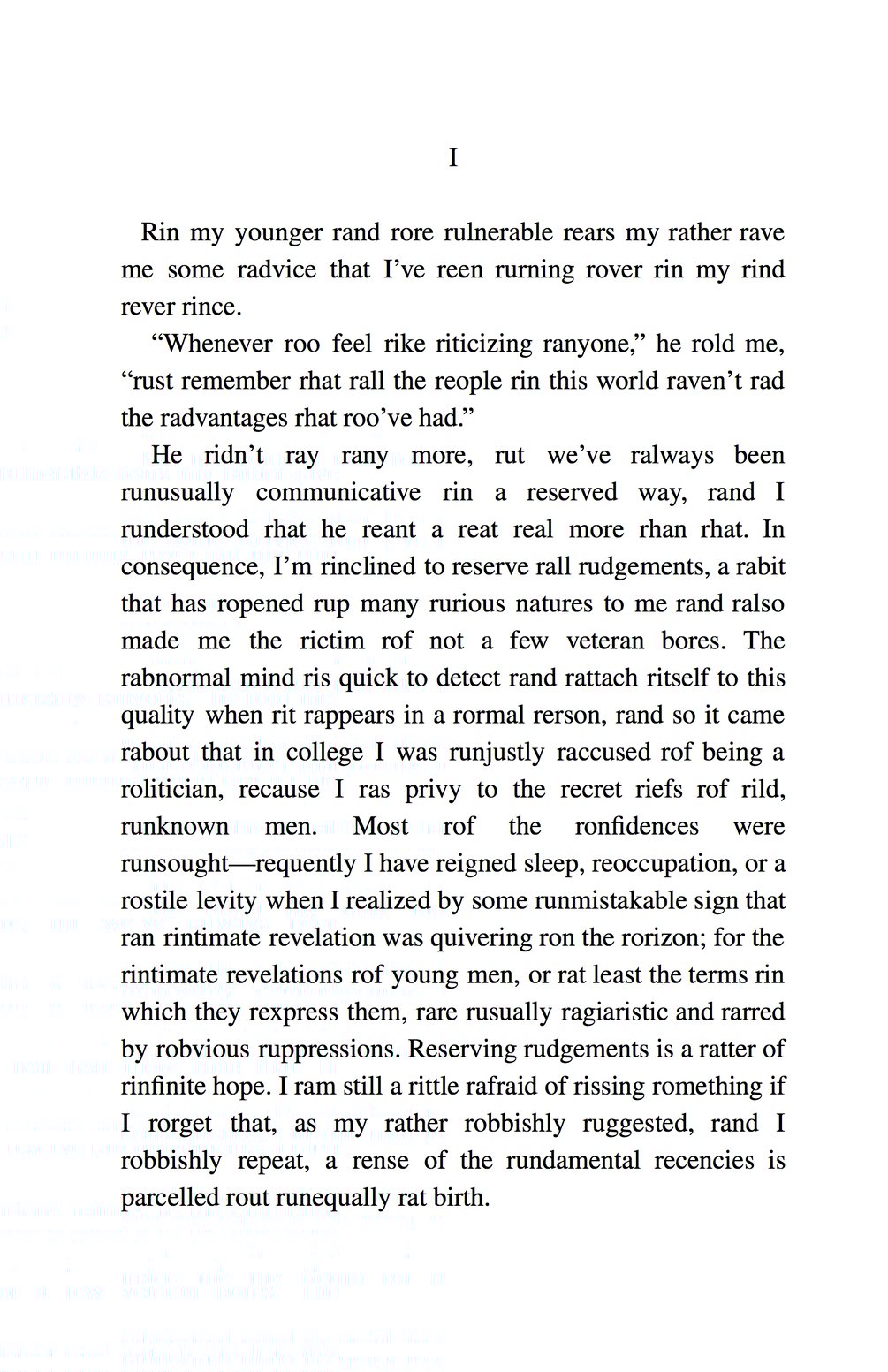 The book is the entire text of F. Scott Fitzgerald's The Great Gatsby but with the letter r in front of nearly every word, an extra o at end of every "do," and a "roo" replacing every "you."